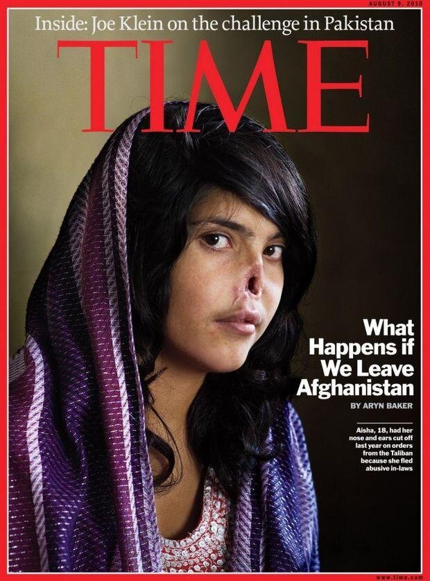 В августе 2010 года журнал "Time" опубликовал фотографию 16-ти летней афганской девушки без носа и ушей. Так весь мир узнал о трагической судьбе Биби Аише. В пятнадцатилетнем возрасте родители девушки насильно выдали ее замуж местному талибану. Мужу она была безразлична, он издевался, часто выгонял её на улицу заставляя спать в загоне с животными. С особой жестокостью к ней относились родственники мужа унижая и зверски избивая её. Девушка умоляла отца забрать ее, но это было невозможно и тогда она решила сбежать. Очень быстро муж ее нашел и сдал в тюрьму(по афганским законам женщин сбегающих от мужа сажают в тюрьму) Через 5 месяцев судьи вернули несчастную девушку обратно мужу. Через несколько дней он со своими братьями решили проучить непокорную отрезав нос и уши оставив умирать в горах. Придя в сознание и истекая кровью девушка в полуобмарочном состоянии добралась до своего отца. Отцу удалось довезти дочь до благотворительной организации и с её помощью вывести девушку из страны
