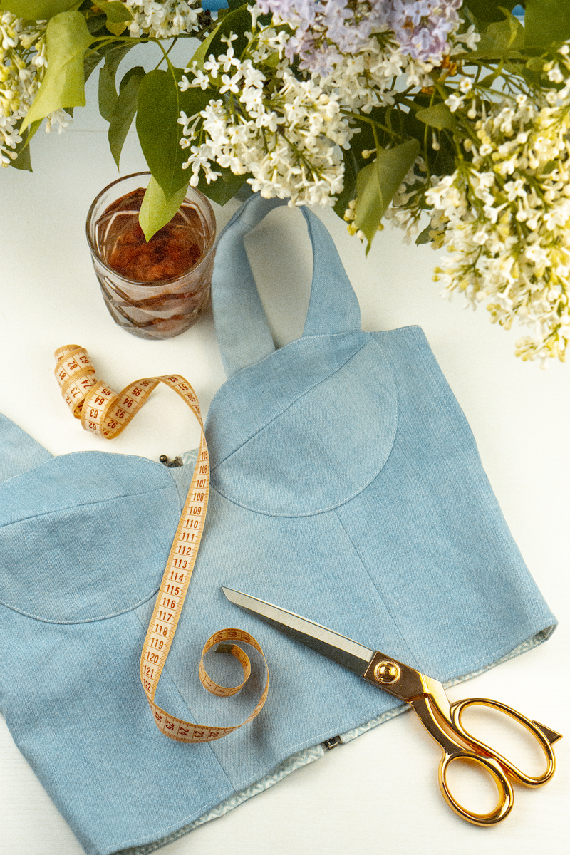 1. Выкроила все детали топа из джинс. Выкройку верха платья Марго я удлиннила на 5 см. При раскрое важно сначала разложить все детали на ткани, чтобы понимать, из какой части джинсов лучше кроить ту или иную деталь. Так же важно: я прикладывала лекала к лицевой стороне (а не изнанке), чтобы видеть оттенок и состояние джинс.