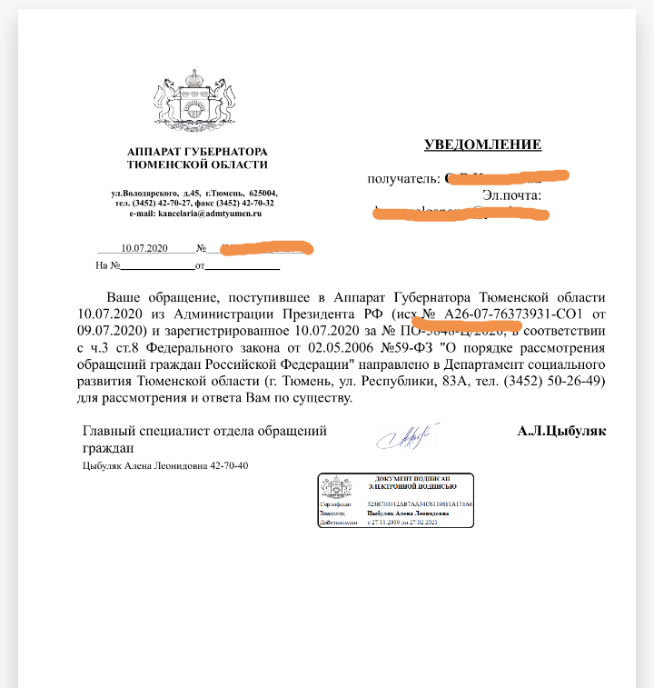 Я уже писала статью где говорилось что писала жалобу Путину, все что было сделано это перенаправленно письмо на имя губернатора, как видно из фото это было сделано 10 июля и с тех пор тишина, не кто не связался со мной, не разъяснили ситуацию, получается мы надеямся что на нашу жалобу как то от реагируют но это не так. Сколько должно рассматриваться? Будет ли какой то вразумительный ответ или все таки придётся опять писать на бездействие местных властей? Как то я писала в здравохранения и ответ поступил очень быстро, при чем и из Москвы, из нашей области а потом и города, со мной вели диалог, объясняли и присылали письма а соц защита у нас не прикосновенна и не пробиваема