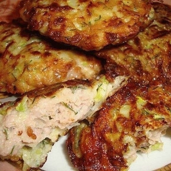 Перец черный молотый - по вкусу. Подсолнечное масло Начинаем пошаговое приготовление: 1. Натираем кабачок на крупной терке, солим и хорошо перемешиваем. 2. Кабачки хорошо выжать и образовавшийся сок слить. 3. Добавляем в кабачки яйцо, лук (можно и без лука, если вы его не любите), специи, зелень. Тщательно перемешиваем. Затем добавляем муку и опять тщательно перемешиваем. 4. Оставляем наше тесто и переходим к начинке. Куриное филе мелко нарезаем или перекручиваем на мясорубке (можете использовать готовый куриный фарш, купленны