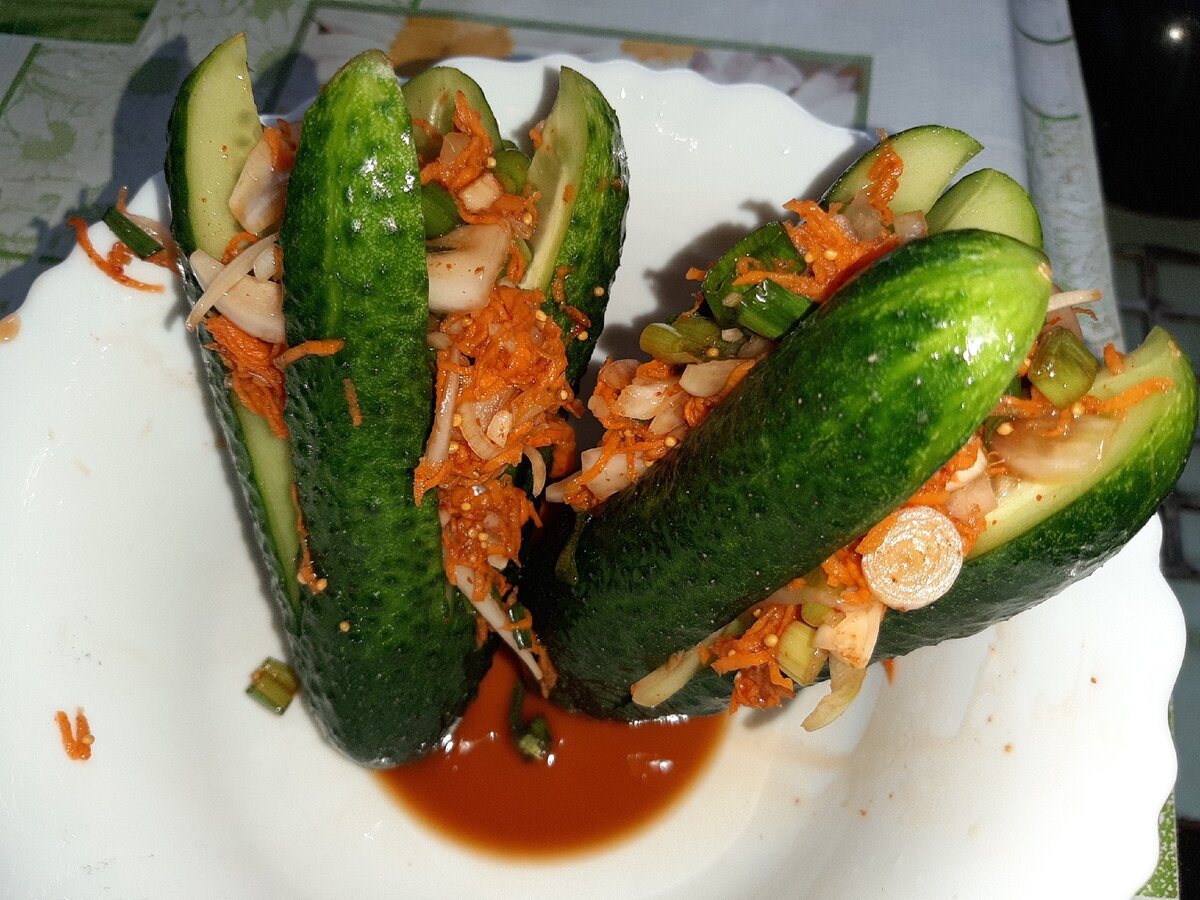 Приветствую вас на моем канале Москвичи в Крыму! Здесь вы найдете статьи о переезде, о жизни в Крыму, рецепты и про заработок на Яндекс Дзен. Буду рада подписке и пальцу вверх! Хочу поделиться с вами рецептом вкусненьких огурчиков на закуску. Для начала нам нужно сделать малосольными огурцы. Как я это делаю я рассказывала в этой статье Малосольные огурцы в пакете. Только здесь нужно разрезать огурец на 4 части по длине, но не дорезая до конца. и засолить в пакете хотя бы на несколько часов. Кладем в пакет огурцы, насыпаем соль, чеснок, зелень, завязываем пакет и убираем в холодильник. Периодически нужно встряхивать. Можно конечно сделать такое блюдо со свежим огурцом, но тогда как будто чего-то не хватает. После того, как огурцы приготовились нужно их сполоснуть от лишней соли и можно приступить к начинке. На два огурца я беру: Морковь натерла на мелкой терке, все остальное нарезала проивольно, но желательно помельче. Нужно смешать все ингредиенты и пожамкать рукой, чтобы блюдо дало с