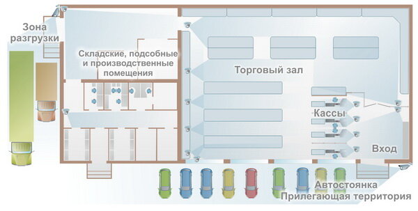 Такими зонами считаются: зона при входе, самая крупная и важная витрина магазина и касса.