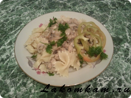 В тарелку выкладываем макароны, сверху поливаем полученным соусом.