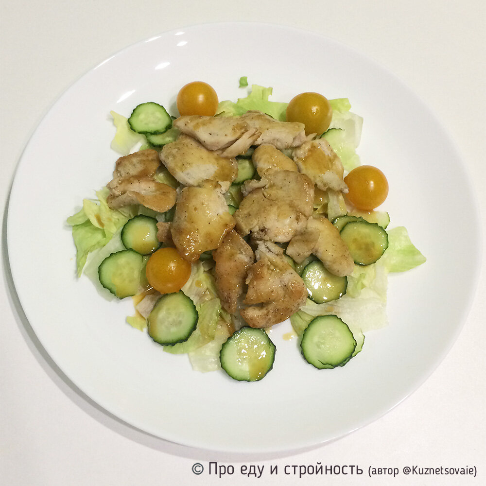 В тёплых салатах хотя бы один из ингредиентов обязательно должен быть горячим при подаче, а поэтому такие салаты я часто готовлю в качестве основного блюда на ужин. И сегодня один из вариантов, который готовится быстро, просто и сможет внести разнообразие в каждодневное меню. Ингредиенты (на 3 порции): Для соуса: Пошаговое приготовление: Салат готовим, раскладывая ингредиенты слоями. Сначала листья салата Айсберг. На одну порцию примерно 40 грамм. Затем огурцы. Я их нарезаю тонкими кружочками. Для одной порции их тоже нужно примерно 40 грамм. Конечно, в каждодневном приготовлении я не пользуюсь весами и кладу ингредиенты уже на глаз, но чтобы на фото были 100% реальные порции, я использую весы и все досконально взвешиваю. Затем добавляем помидоры Черри. Для одной порции примерно 45 грамм. Ели помидорки маленькие, то это как раз 4 штучки (каждый помидор такой весит примерно 10-12 грамм). Курицу нарезаем тонкими кусочками и обжариваем на растительном масле в течение нескольких минут