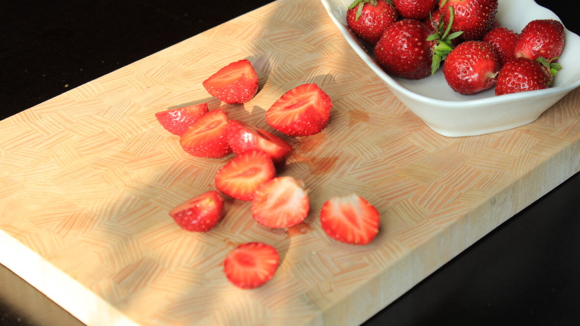 Тем временем клубнику режу пополам и выкладываю на дно формы.