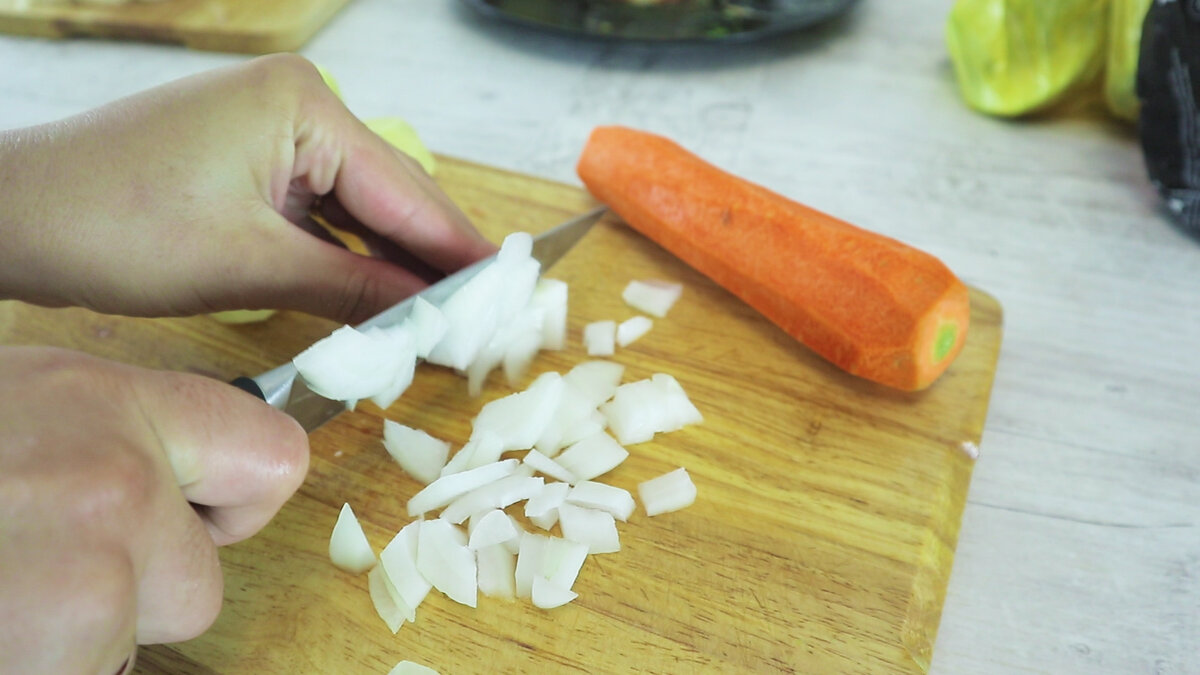 Мелко нарезаем лук.