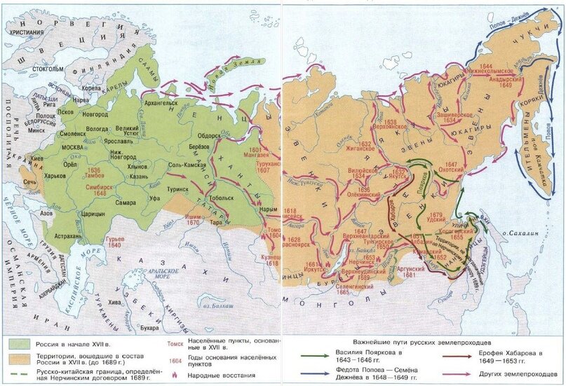 В XVII в. продолжалось активное освоение Сибири. Русские вышли к берегам Тихого океана, Камчатки, Курильских островов.
