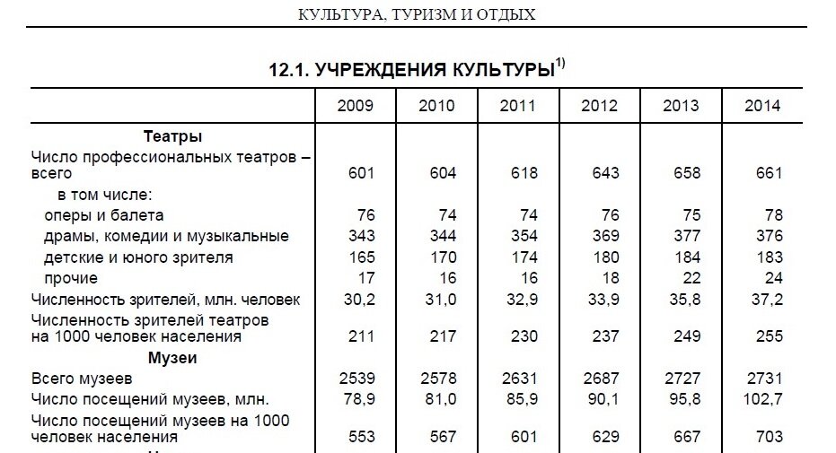 Также увеличился показатель средних потребительских цен на виды услуг культуры. В частности, потребительские цены за билет в театр выросли более, чем в два раза (с 243,09 руб. в 2009 году до 536,64 руб. в 2014). По имеющейся таблице Росстата сложно судить, какая причина этого увеличения, так как предположить можно три: увеличение интереса к театру, увеличение цен на билеты театрами в связи, увеличение з/п потребителей.