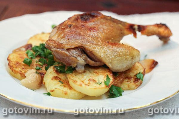 Конфи из утиных ножек Конфи из утиных ножек (Confit de canard) — классическое французское блюдо. Подготовка блюда н займет много времени, а вот само приготовление длится долго – утиные ножки запекают в духовке при низкой температуре несколько часов. Результат – нежнейшее сочное мясо с хрустящей корочкой. Причем, приготовить утиные ножки можно впрок: если их оставить в вытопившемся жиру, то они будут храниться в холодильнике не меньше месяца. Для рецепта вам потребуется: для пряной смеси: Рецепт приготовления: Для пряной смеси смешать морскую соль, веточки тимьяна, очищенные и разрезанные на лепестки зубчики чеснока головки чеснока, раскрошенный лавровый лист. Этой смесью натереть утиные ножки и сложить их в подходящую миску. Закрыть миску пленкой и оставить просаливаться минимум на сутки. Но можно и дольше. Через сутки отряхнуть утиные ножки от соли и специй. Уложить в жаропрочную форму кожей вверх. Промежутки между ножками заполнить чесноком и залить растопленным утиным ж