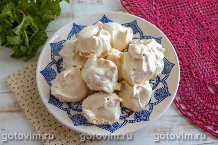 Этот воздушный десерт получает совершенно новый аромат и вкус благодаря добавке свежей мяты. Мятное безе можно подавать к чаю или использовать при оформлении тортов, пирожных и других десертов. Соединив два безе с помощью сливочной или масляной прослойки, у вас получится невероятно вкусный десерт, который не стыдно поставить даже на праздничный стол. Не рекомендуется использовать в рецепте сушеные листочки мяты. Только свежая зелень придаст десерту необходимый аромат и изысканный вкус Для рецепта безе вам потребуется: Рецепт приготовления безе: Отделяем белки от желтков, аккуратно разбив хрупкую скорлупу, взбиваем их с помощью миксера 1-2 минуты, чтобы масса стала воздушной и заметно увеличилась в объеме. Насыпаем тонкой струйкой сахар, постоянно перемешивая белоснежную массу. Продолжаем взбивать белки с сахаром, пока масса не станет плотной и значительно не увеличится в объеме. Мелко режем ножом чистые, сухие листочки мяты и примешиваем их ко взбитым с сахаром белкам, двиг