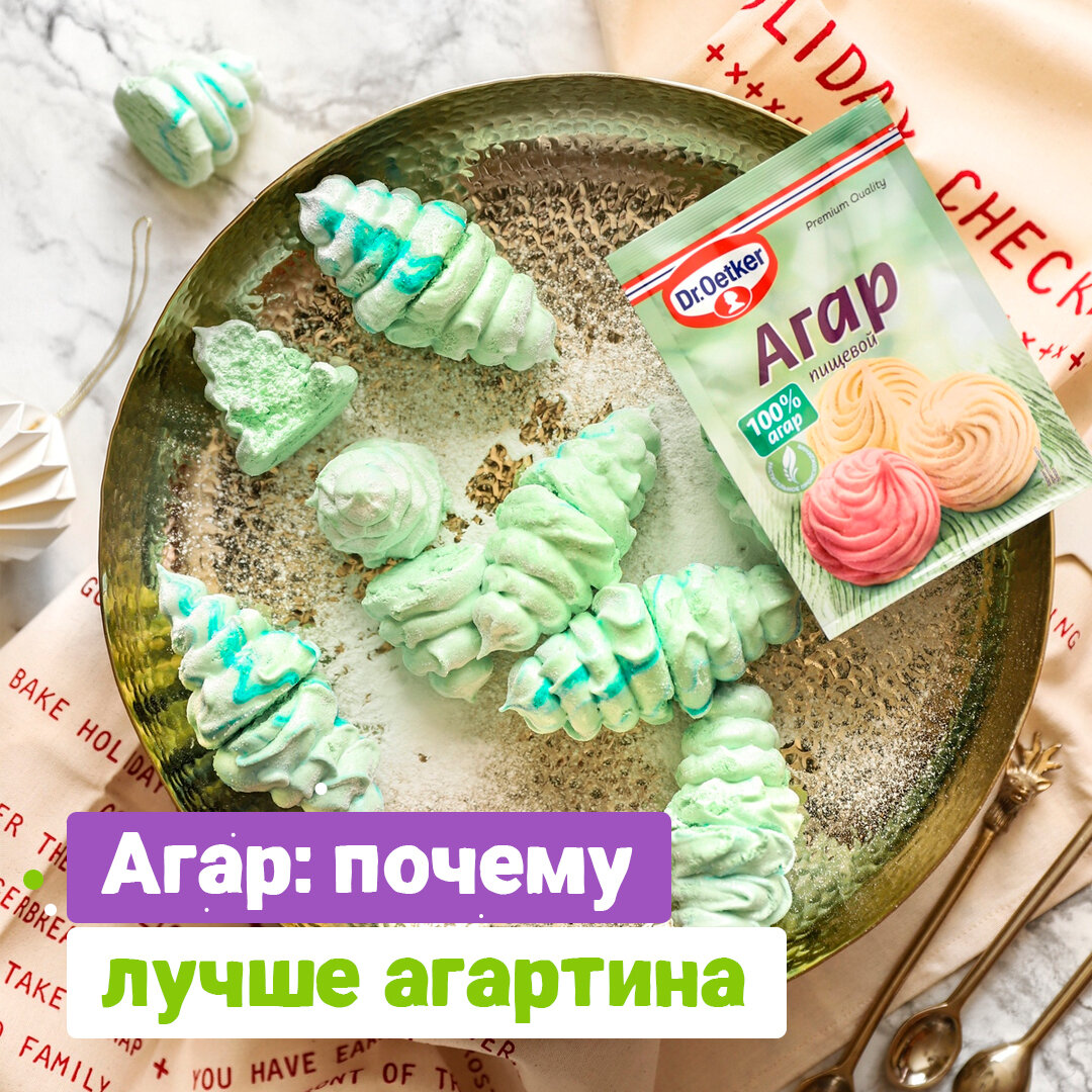 Ожидаемый результат с агаром - плотный, высокий, упругий десерт. Это как раз то, что дает агар Dr. Oetker. Агартин или иные загустители могут не давать нужную плотность. На упаковке разных производителей написано «агар», а в составе на первом месте - другое вещество. Его содержание может доходить до 80%, тогда как сам агар содержится лишь в 20% всей массы. Такая смесь называется агаратином, и она не даёт нужной стабильной текстуры вашим десертам.