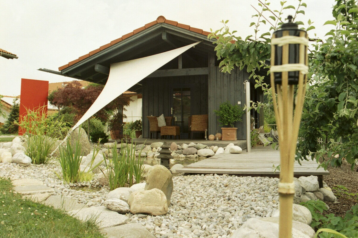 В классическом саду по фэншуй непременно должны быть водоемы, например, небольшой пруд/ручей или фонтан, красные и оранжевые цветы, деревья и кустарник.