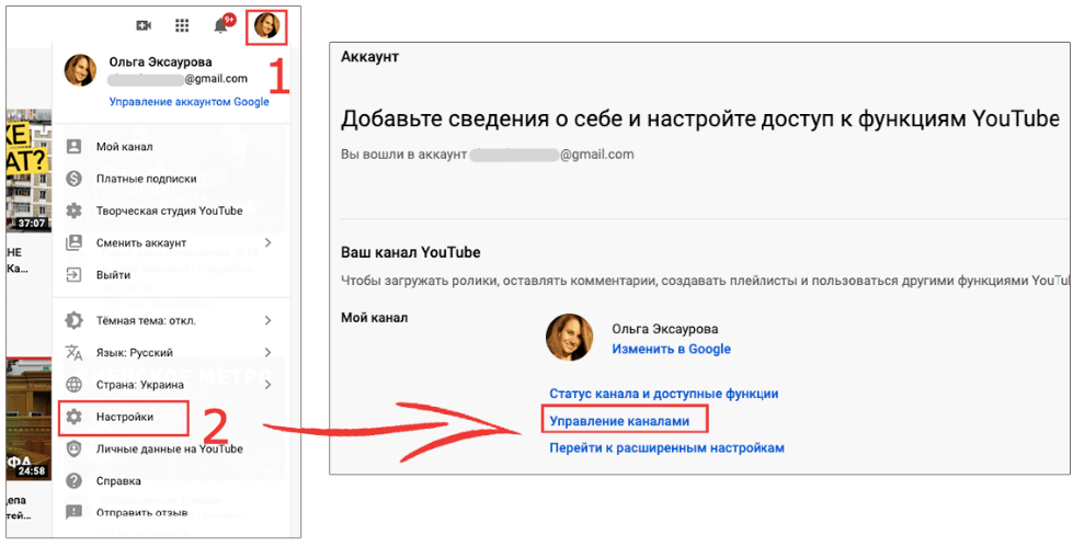 Зайдите на YouTube — кликните по значку вашего аккаунта (это правый верхний угол) — найдите в меню Настройки — в открывшемся окне кликните на Управление каналами: