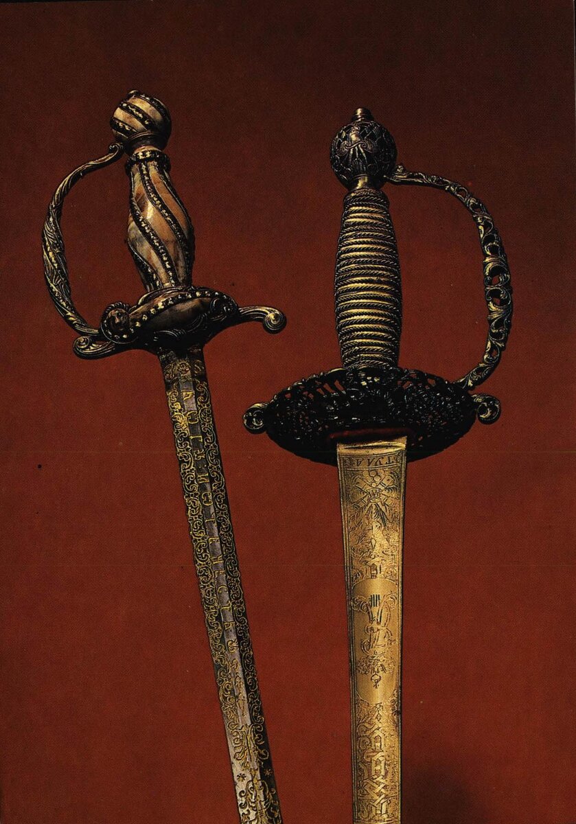 Парадные шпаги России 18 века В XVIII веке парадная изящная шпага являлась неотъемлемой частью и значительным дополнением роскошного мужского придворного костюма. Для изготовления эфесов шпаг использовали золото, серебро, камни. Но, пожалуй, особое восхищение вызывает умение мастеров из недрагоценного материала – стали – сплетать тончайший кружевной узор или заставлять играть алмазным блеском ограненные стальные бусины. Парадное придворные шпаги, выполненные тульскими и сестрорецкими оружейниками во второй половине XVIII века, являются примерами подобной обработки металла и поделочного камня. Шпага (слева) Россия. Сестрорецк. 1752г. Сталь, агат Ковка, насечка, огранка стали Длина 89 см Шпага (справа) Россия. Тула. 1769г. Сталь, медь Ковка, насечка, резьба, золочение Длина 103 см
