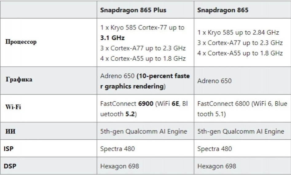 Вот некоторые из ключевых особенностей / различий между Snapdragon 865 Plus и оригинальным чипом Snapdragon 865 (различия выделены жирным шрифтом):