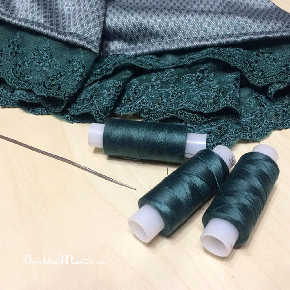 Дело в том, что я не смогла найти узкое кружево или тесьму в тон нижнего широкого покупного кружева, а это очень насыщенный изумрудный цвет, и поэтому я решила связать кружевную тесьму сама.