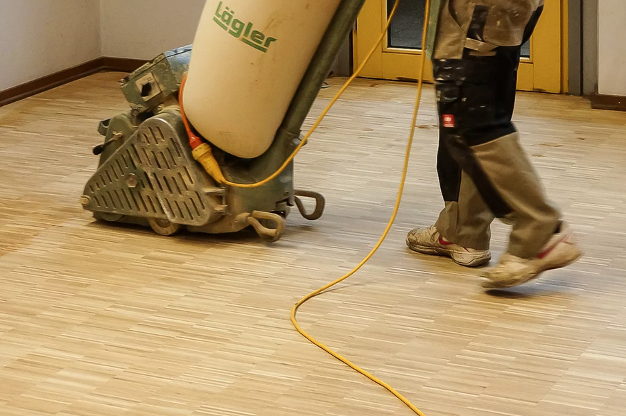 Сотрите верхний слой наждачной бумагой. Делается это дважды. Первый раз работайте наждачной бумагой со средним показателем абразивности, второй – с меньшим. Шлифовку можно сделать специальной машинкой, вручную или с помощью старой обуви. На одну подошву приклейте наждачку среднего значения, а на второй – более мягкую. Пройдитесь по полу шаркающими движениями. Это непрофессиональный способ, но он наиболее прост и не требует специальных знаний.