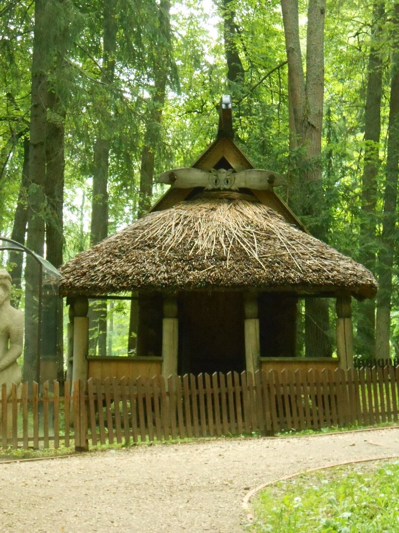 "Здесь Русью пахнет" - главное, что приходит в голову, когда вдыхаешь горячий травянистый аромат, высадившись на станции "Абрамцево". Каюсь, грешна. До меня этим описанием пользовался художник Нестеров, но... Ничего не могу поделать. На свете очень мало мест, для которых существуют столь точные, как стрелы древних, слова. Если бы картины "Алёнушки" еще не было, она просто обязана была бы родиться здесь. Как и другие мифы и сказки... По сути, в Абрамцево, всё равно что в гостях у сказки. Из всех усадебных объектов на территории усадьбы - этот любим мною больше всего. Очарование на куриных ножках. Всё старинное и всё время запечатлела. Но Избушка точно живая. Словно слышится приглушенный детский смех и таинственный шёпоток сквозь толщ веков. Избушка на курьих ножках расположена рядом с абрамцевским домашних храмом Спаса Нерукотворного. Стоят они, оба, в тени хвойных деревьев и очень гармонично смотрятся рядом. Иронично. Точно так же языческое сознание, которое является нашей г