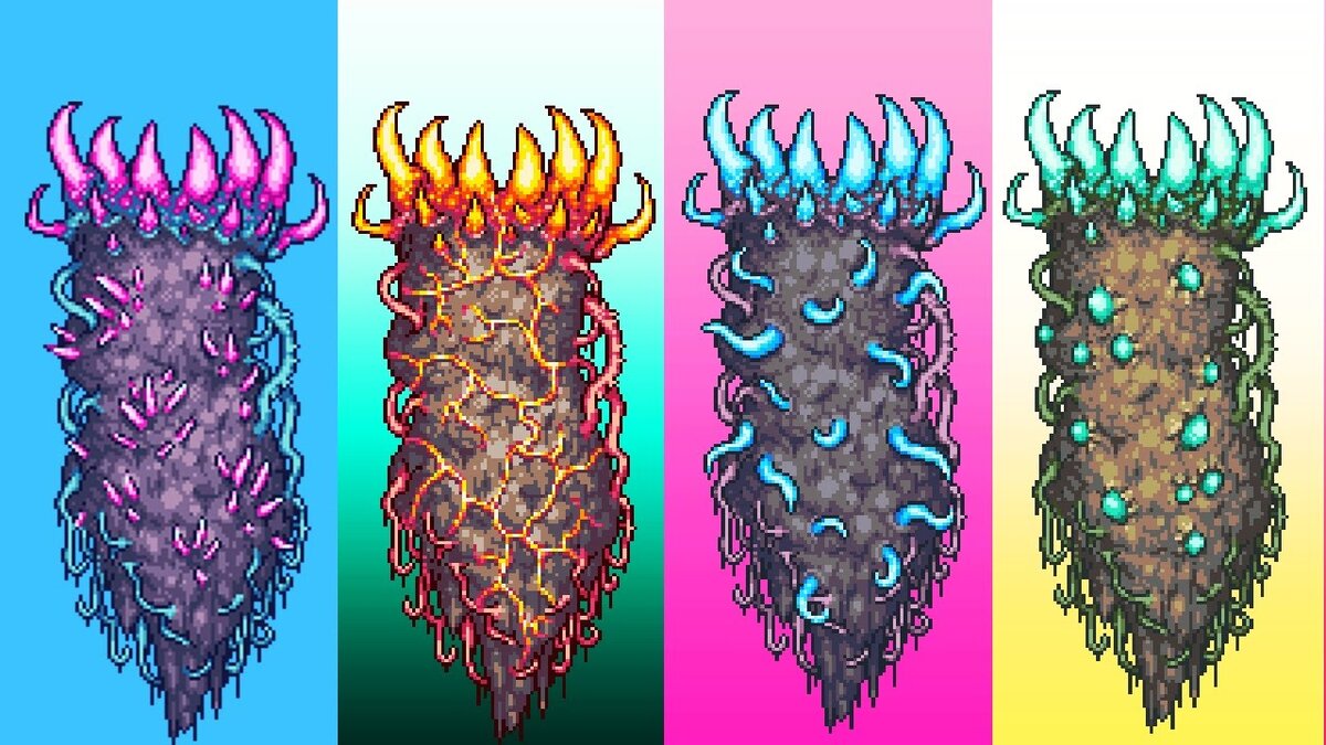 Всем хай с вами GameMan! И это 9 часть про боссов из игры террария. Приятного чтения! Небесные башни Небесные башни – серия из четырёх боссов, добавленная в обновлении 1.3. Каждая из этих башен создаёт возле себя уникальный биом с сильными, и нигде больше не встречающимися существами. Все четыре башни появляются в мире после победы над культистом-лунатиком. Каждая из башен окутана непробиваемым щитом, снять который может только убийство 100 существ (150 в эксперт моде), призываемых башней. Все без исключения существа не имеют какой-либо добычи. После убийства большого количества мобов щит пропадает, но существа продолжают спавниться. Игроку остается только добить башню, у которой 20000 единиц здоровья. После уничтожения башни мобы перестают появляться. Касание башен не наносит урона, но некоторые из них имеют оборонительные способности. Каждая башня дропает от 12 до 60 фрагментов (18-90 в режиме эксперта). Каждой башне соответствует свой тип фрагментов. Спустя 30 секунд после уничто