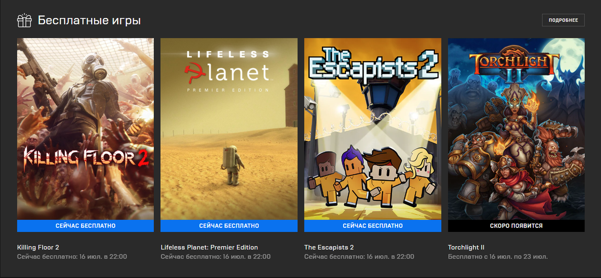 Привет, я давно не писал о халяве от Epic Games, потому что в последнее время они обещали нормальные игры, а раздавали мусор, и вот теперь, настал момент, наконец нормальные игры. Давай же посмотрим на них. Красота, не правда ли? Целых 3 игры, из которых 2 не просто играбельные, а ОТЛИЧНЫЕ. Поехали смотреть подробнее. 1) Killing Floor 2 Это кооперативный survival шутер, в котором ты бегаешь и стреляешь по зомбям. Большое кол-во пушек и типов врагов, а в конце раунда тебя ждёт ещё и босс. И поверь мне, с друзьями это РЕАЛЬНО ВЕСЕЛО. Видео обзор: 2) Lifeless Planet Тут нечего сказать, это некая инди головоломка-платформер... Но, как говориться, "на халяву и уксус сладкий" Видео обзор: 3) The Escapists 2 Вторая шикарная игра, это вторая часть(первую в EGS уже раздавали ранее) ролевой стратегий с уникальной задумкой, тебе надо сбежать из тюрьмы используя для этого свою хитрую голову и огромное кол-во интересных игровых механик. Это не объяснить, в это обязательно надо поиграть. Видео обз