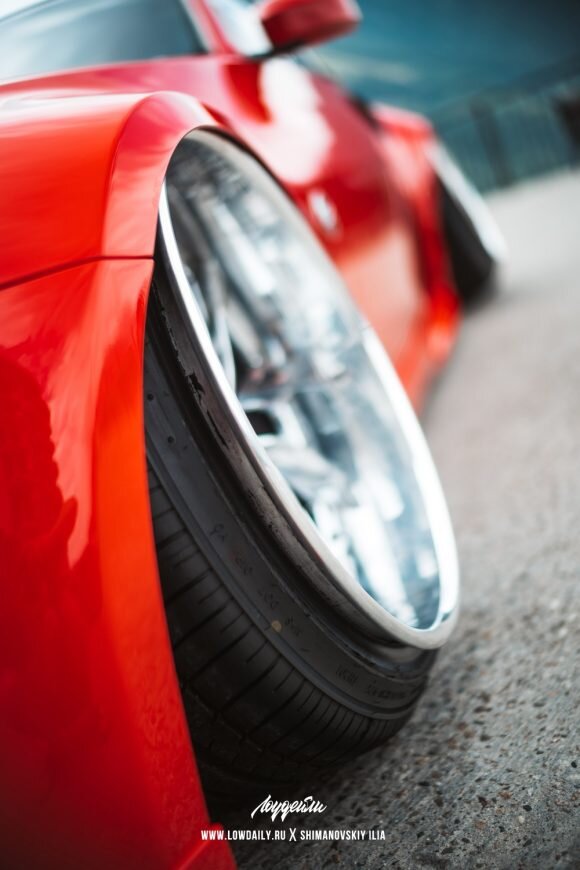Хромированные диски Weds Kranze Chrishna 20’ 12J/13J уже были, но под них пришлось изготовить передние и задние рычаги, которые бы позволили добиться желаемого отрицательного развала в 11 и 13 градусов спереди и сзади соответственно! Затем наступило время расширения, и здесь стояла задача максимально не разрушить заводские линии кузова, не превратить автомобиль в похожий на шарж. Арки вписались настолько гармонично, что если не заметить лючок бензобака, который получился несколько утопленным в саму арку, можно и не понять, что это не “завод”. Получилось очень аккуратно, в противовес расширением на клепках, которое сейчас гораздо более популярно. Цвет, кстати, тоже не заводской, Арсен сам его выбрал, отказавшись от предложенных оранжевых вариантов. Получился красный, который находится где-то близко к оранжевому. Для пущей агрессивности автомобилю были добавлены “шотганы” на выхлопе. Ну и не обошлось без тонировки, которая в данном проекте уместна – это же все-таки отчасти “VIP”!