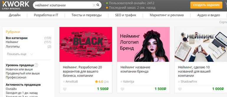 Услуги фрилансеров, занимающихся подбором креативных имен для бизнеса, пользуются спросом. Вы можете заработать хорошие деньги на нейминге, просто создав страничку на одном из ресурсов для фрилансеров. Часто такие заказы попадаются на сервисах work-zilla и kwork.