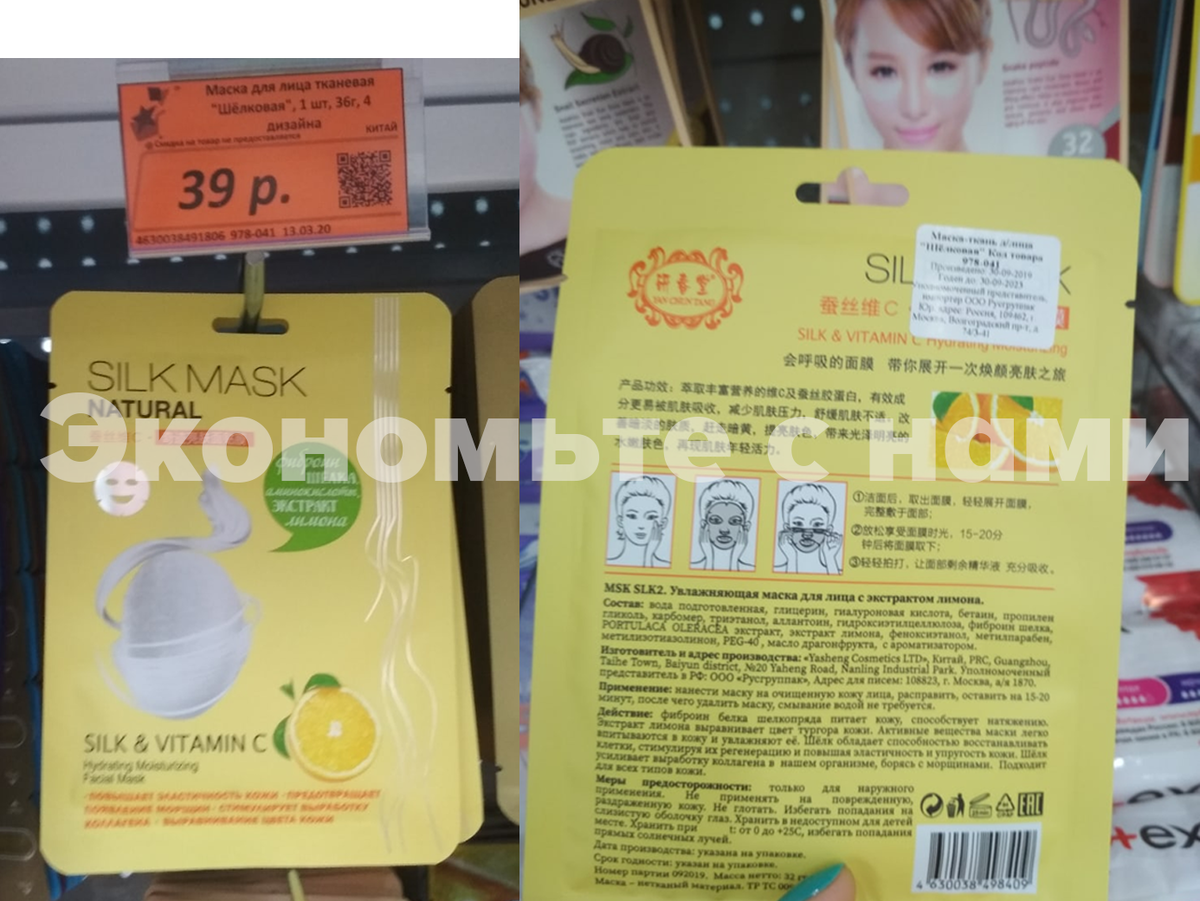 На днях вместе с коллегой по работе гуляли по Галамарту в обеденный перерыв. От дома этот магазин далеко, а вот от работы - всего в пяти минутах. Вообще ей нужна была новая керамическая кружка. На старой было уже много сколов, и коллега её выбросила. В общем-то я пошла с ней просто за компанию, чтобы заодно посмотреть, что интересного появилось на полках. Маршрут до керамических кружек у нас был кольцевой, поэтому мы успели пройти полки со всякой мелочью, спортивными товарами, садово-огородными принадлежностями и всем для рыбалки. Остановились мы в отделе косметики - там были неплохие скидки, и мы решили осмотреть все подольше. Удивил большой выбор тканевых масок разных производителей и патчи. Понравились сыворотки для кожи вокруг глаз. А также кремы и скрабы для лица и тела. Давайте посмотрим подробнее, что мы там нашли и по какой цене. Тканевая маска для лица "Шёлковая" - в магазине три разных вида по цене 39 рублей Очень бюджетная тканевая маска. В среднем цена на такие маски в дру