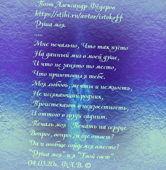 Поэт Александр Фёдоров https://stihi.ru/avtor/istokoff Душа моя. ..... Мне печально, Что так пусто На данный миг в моей душе, И что не занято то место, Что приготовил я тебе. Моя любовь, мечты и нежность, Не иссякающий родник, Проистекают в неизвестность, И оттого в груди саднит. Печаль моя- Печать на сердце Вопрос, вопрос, и где ответ? Да и вообще сойдёмся вместе? "Душа моя" и я "Твой свет". 04.03.20г. Ф.А.В. ©