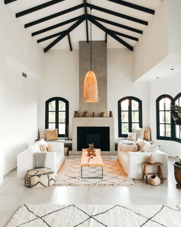 Отправляйтесь с нами, чтобы посетить нетипичный интерьер, который полон красивых деталей в черно-белых тонах. Вдохновитесь необычной дозой окон с изогнутой аркой, а также натуральными потолочными балками. Как вам это нравится? Гостиная в сочетании простого минимализма и стиля бохо прекрасно вписывается в интерьер. Обратите внимание на три основных цвета-белый, черный, а представителем натурального оттенка является дерево. В центре комнаты вы можете увидеть дизайнерский журнальный столик из массива дерева, камин и два одинаковых дивана. Приятный ансамбль дополняют минималистский ковер и вязаные люстры. Акцент всего интерьера определенно обрамлен темным деревом. Будь то потолочные балки или жалюзи. Уникальность этого интерьера заключается главным образом в игривости высоты потолков и нетипичного расположения комнат. Благодаря открытым видам весь интерьер выглядит воздушным и просторным. Сочетание черного и белого подходит для любой кухни. Вся комната выглядит роскошно и элегантно, в осно