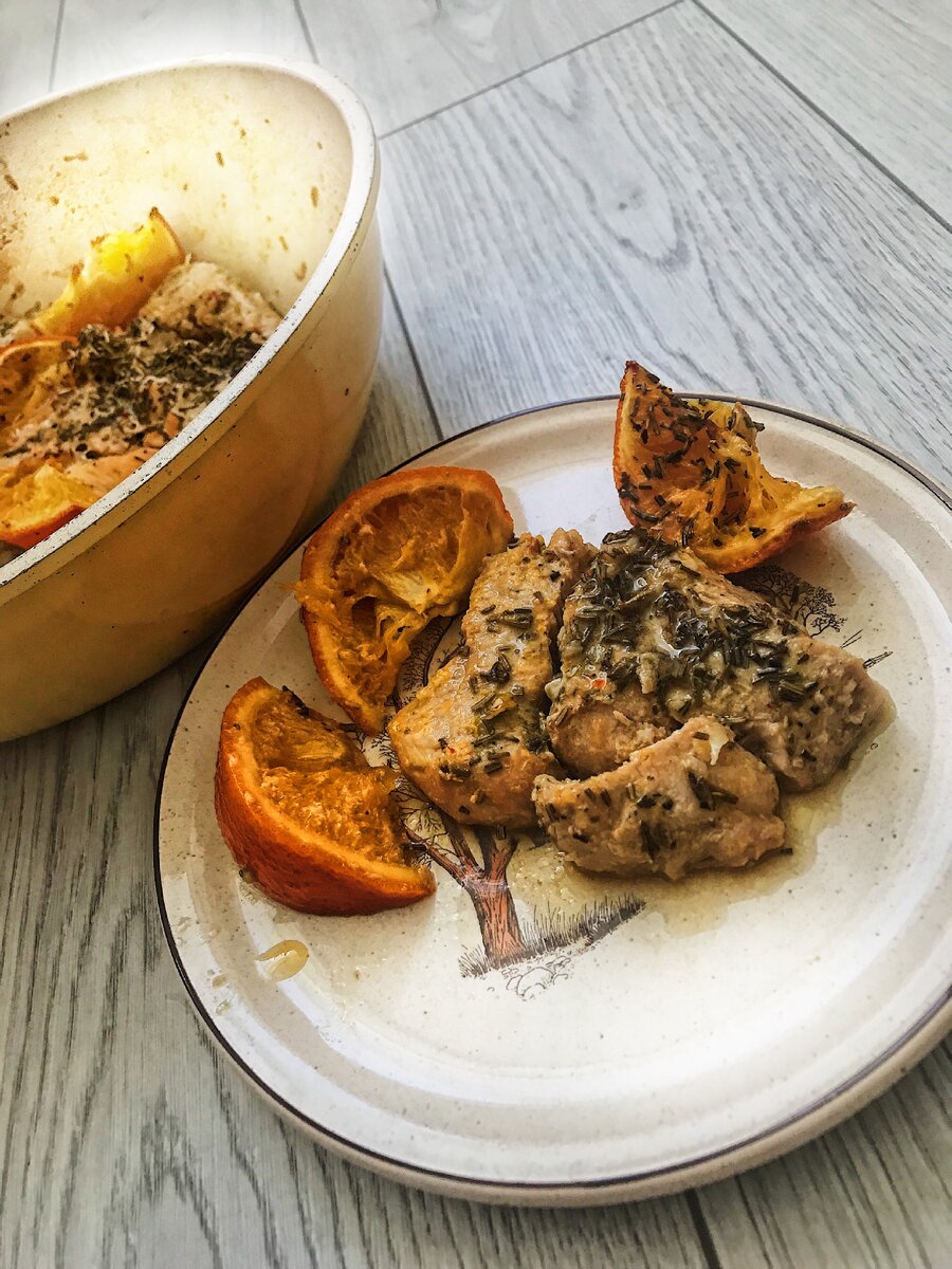 Гости на пороге и хочется приготовить и быстро и вкусно. Предлагаю запечь куриное филе, либо куриное бедро с цитрусами. Минимум затрат, а вкус удивит всех ) 🔸Куриное филе(бедро) - 600 гр 🔸Чеснок - 2 головки 🔸Масло растительное - 30 гр 🔸Соус соевый - 20 гр 🔸Прованские травы - 1/2 ч.л. 🔸Лимон - 1/2 шт 🔸Апельсин - 1 шт 🔸Розмарин - 1/2 ч.л. 🔸Мёд - 25 гр 🔸Перец - по вкусу 🔸Соль - по вкусу Как приготовить⬇⠀⠀ ✔Маринуем куриное филе (бедро): режем курочку на куски, чеснок пропустить через чеснокодавку. В форму, где будет запекаться блюдо, выкладываем мясо поливаем маслом растительным, соевым соусом, посыпаем прованскими травами, посолить, поперчить, добавляем чеснок и сбрызгиваем соком лимона, тщательно обмазываем со всех сторон. Апельсин порезать на дольки и выдавить сок на филе. Выдавленные дольки разложить на мясо сверху посыпаем розмарином (можно добавить свежий), растапливаем мёд и поливаем курочку сверху. Накрываем пленкой и оставляем на 1-1,5 часа. ✔Выпекаем в разогр