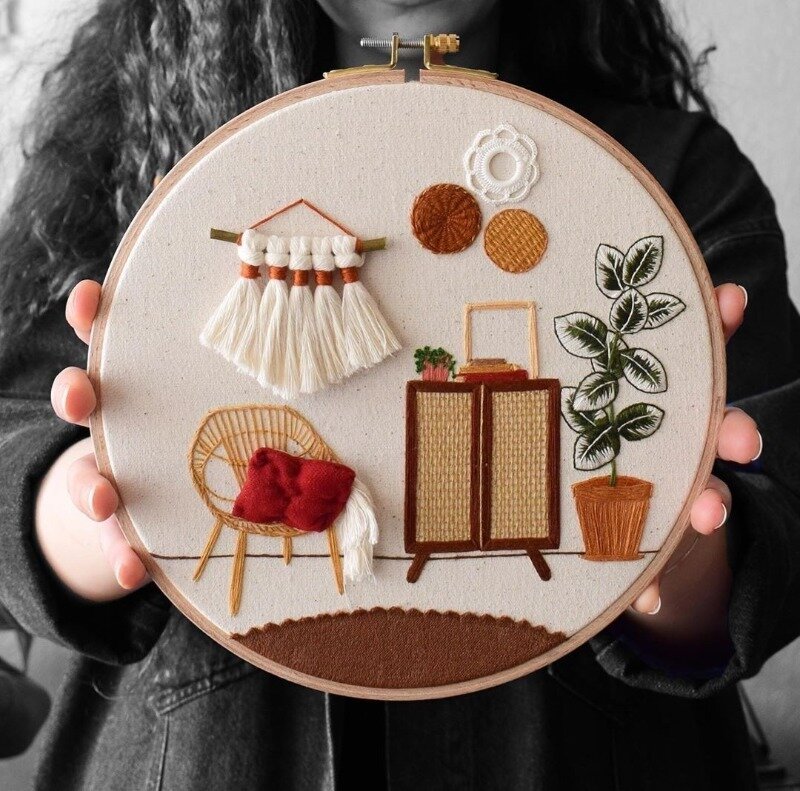 Образец простоты — её вышивка с гармоничным, милым сюжетом. Перед нами уютная комната с плетёным креслом, ковриком цвета карамели, комодом и симпатичным фикусом в кадке. Интересная деталь, — стена в этой комнате декорирована разными вышивками и макраме.