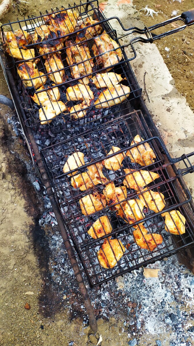 Говоря честно, я думал что получится не очень, так как курица жарилась по краям, но внутри оставалась сырой. Но когда угли начали греть не так сильно, шашлык начал жариться лучше, в итоге мой первый шашлык получился очень даже вкусным.