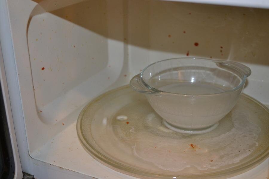Мыльная вода будет кипеть и немного прольется на блюдо. Поэтому не стоит наливать в миску больше половины ее объема. Мягкий, теплый жир стираем губкой или тряпочкой из микрофибры. Последний способ оказался наиболее действенным. Пятна полностью отошли, микроволновка сияет чистотой как новая!