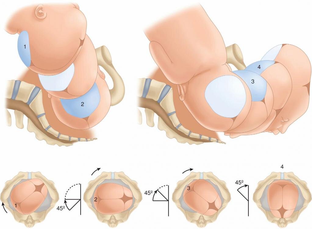 Во время потуги происходит внутренний поворот плечиков и наружный поворот головки. Плечики из поперечного переходят в прямой размер выхода таза, головка при этом личиком поворачивается к правому или левому бедру матери, противоположному позиции плода.