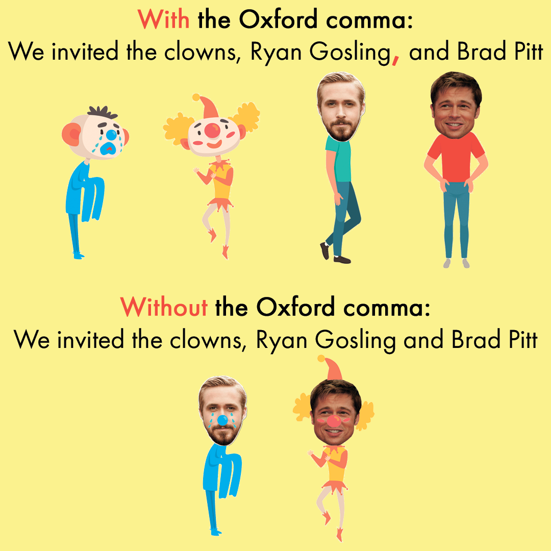Мы сделали для вас максимально наглядную карточку, которая поможет вам раз и навсегда понять, зачем нужна Oxford comma (ее еще иногда называют serial comma). Это такая особенная разновидность запятой в английском языке, которая ставится перед союзом (вроде and (и) или or (или) между однородными членами предложения, то есть там, где ее по сути быть не должно