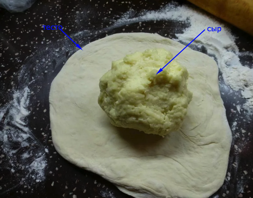 Тесто хорошо поднимется, мы его обминаем, выкладываем на рабочую поверхность посыпанную 70г муки, немного вымешиваем минуты 2-3. Далее формируем 3 одинаковых шара. Далее придаем руками этому шару вид круглой лепешки, не используйте скалку, тесто легко поддается рукам. Кладем в центр наш шар из сыра как показано на картинке, далее защипляем тесто, как огромную хинкали. Переворачиваем хачапури. Разминаем руками получившуюся хинкали в лепешку, аккуратно распределяя сыр таким образом. Делаем отверстие в центре и выпекаем на максимальной температуре, которая позволяет духовка на верхней полке 10 минут.