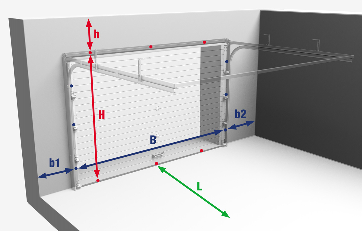 Часть 2 От правильного замера параметров проема и помещения, в котором будут установлены секционные ворота, зависит качество и скорость их монтажа. Для снятия необходимых показателей достаточно рулетки и строительного уровня. Все замеры производятся внутри помещения. Замер каждой величины рекомендуется производить как минимум по трем точкам - около одного угла, затем посередине, и у второго угла. Выбирается большее значение. Секционные ворота представляют собой рамную конструкцию, устанавливающуюся изнутри проема, крепление выполняется по плоскости пристенков и притолоки, а это значит, что при замере необходимо проконтролировать, что пристенки и притолока находятся в одной плоскости. К моменту замера очень важно знать уровень чистового пола. Если его пока нет, то следует отметить его уровень на стене.В случае готового чистового пола следует проконтролировать его уровень. Не менее важным является определение пространства для открывания ворот - глубины помещения. Необходимо обратить вним