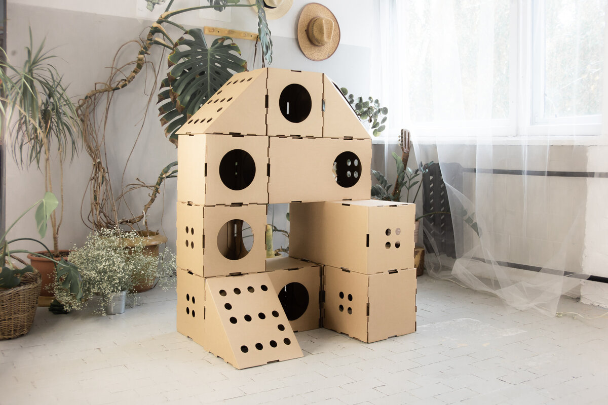 В этом домике все предусмотрено для динамической игры, это место для качественной засады и место для пряток. Благодаря большим круглым отверстиям кошка может попасть в любое место этого