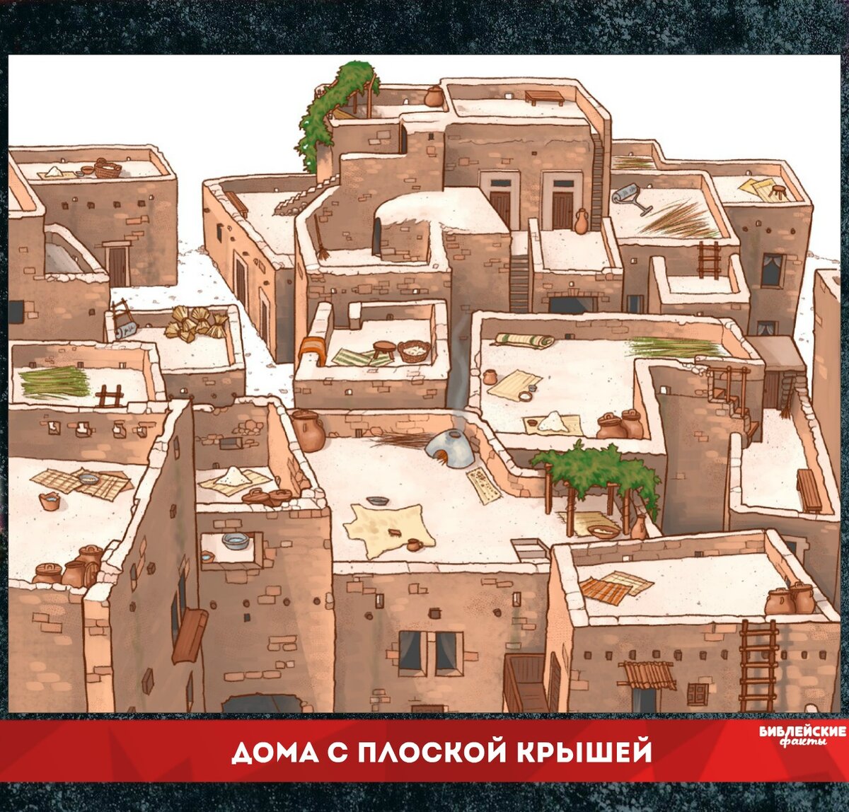 📖 - Это интересно! 🔹 - Типичные дома с плоской крышей. Крыша семейного дома была центром деятельности. Отец мог собирать там свою семью, чтобы поговорить о Боге. 🔹 - Здесь выполняли разные работы (обмоло́т зерна, сушка, ткачество, заготовка продуктов и другие хозяйственные работы). 🔹 - Там члены семьи отдыхали на солнце, занимались домашней работой. А в летнее время это было идеальное место для сна. 🔹 - Мужчины часто поднимались на кровлю дома, чтобы помолиться; здесь же они держали свои инструменты. 📕 - Однажды апостол Петр поднялся в полдень на крышу, чтобы помолиться; Петр около шестого часа взошел на верх дома помолиться... (Деяния 10:9—16). Больше интересных Библейских Фактов