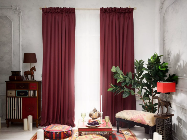 Большое значение имеет и степень светопроницаемости ткани: солнечные лучи, проникая через красные шторы, будут придавать розоватый оттенок всему, что находится в комнате. Если этот эффект нежелателен, шторы можно сделать двухслойными, с подкладкой; если, напротив, нужно добиться именно такой подсветки, красные шторы можно сделать из полупрозрачного материала — шелка, тонкого льна, органзы.