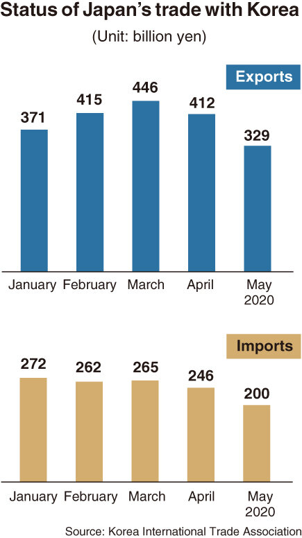 По данным Корейской ассоциации международной торговли и Японской таможенной ассоциации, экспорт Японии в Южную Корею в мае составил 329,3 млрд иен (3 млрд долларов США), что на 18% ниже уровня прошлого года.