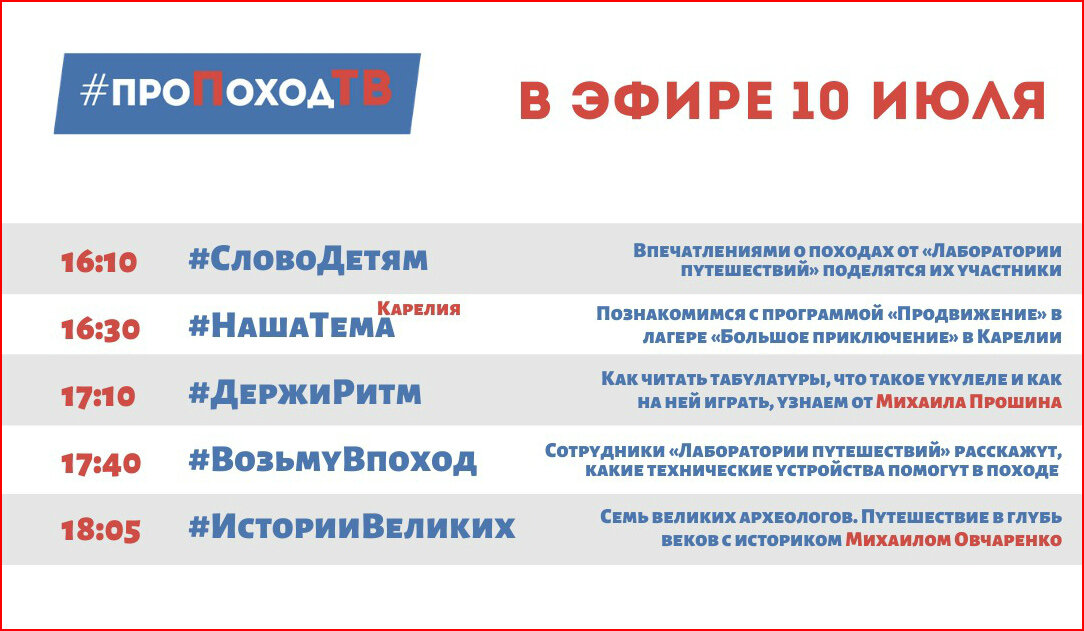 Вы знаете, некоторые наши ребята, которые ходили в поход с «Лабораторией путешествий», умеют играть на укулеле. Это такая маленькая гитара. Хотите тоже играть на этом диковинном инструменте? Смотрите рубрику #ДержиРитм и Миша Прошин вас научит. Продолжаем знакомить вас с нашими программами. И сегодня вы узнаете, что такое «Продвижение». Смотрите на нашем ТВ #нашатема.карелия. Какие технические хитрости помогают нашим инструкторам выжить в походе? Смотрите #возьмувпоход, и вы узнаете все наши секреты. Присоединяйтесь к #пропоходтв, и вы узнаете много интересного. Кроме того, вы сможете пообщаться в прямом эфире по телефону с ведущими и задать им свои вопросы.Телефон прямого эфира: +7-499-379-11-22 Смотреть трансляцию прямого эфира можно на сайте «Про поход ТВ», в блоге Дзена, и в соцсетях группы «Лаборатория путешествий»: YouTube Facebook Instagram ВКонтакте
