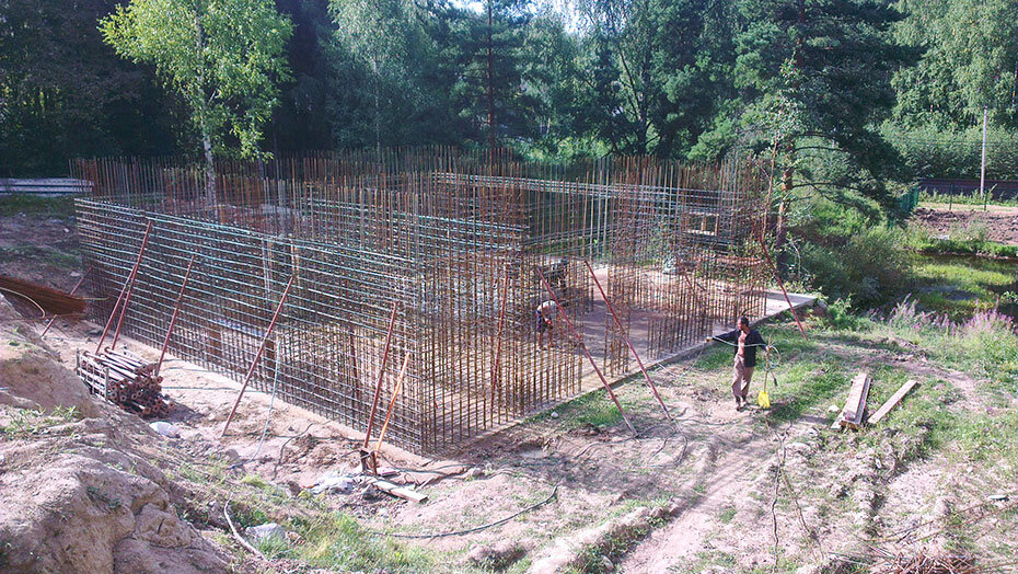 Т.к. цоколь принимает на себя всю нагрузку здания, в его строительстве задействуется высокопрочные марки бетона, а для армирования используется арматура, в основном диаметром 12мм. Возведение цокольного этажа начинается с устройства фундаментной плиты и далее происходит создание металлического каркаса самого цокольного этажа, как это можно увидеть на фотографии ниже.