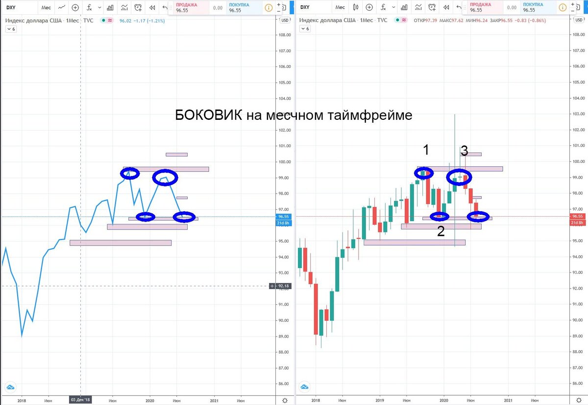 Прогноз курса ДОЛЛАРА. Будет ли обвал рубля? Контрольная точка пройдена, тренд вверх! Сегодня мы поговорим о прогнозе курса доллара исходя из технического анализа. Соотнесем индекс доллара с парой рубль/доллар. И так поехали! Для начала посмотрим на индекс доллара к основным валютам. Анализируя месячный таймфрейм мы видим, что цена подошла к нижнему пределу боковой проторговки, боковой тренд образовал формацию "один, два, три" на параллельных уровнях, в ожидании отскок вверх, как минимум на нижних таймфреймах (недельный, дневной) Перейдем на следующий более слабый таймфрейм недельный, тут видим отскок от месячного уровня вверх и ретест этого же уровня, ожидаем повторный отскок вверх, как минимум до следующего верхнего недельного уровня. Теперь перейдем к техническому анализу пары рубль/доллар. Мы наблюдаем 3-х месячный тренд вниз на недельных свечах, который остановился на цене в 68 рублей, после чего отскочил и сформировал пробой верхнего уровня с закрытием выше верхнего недельного