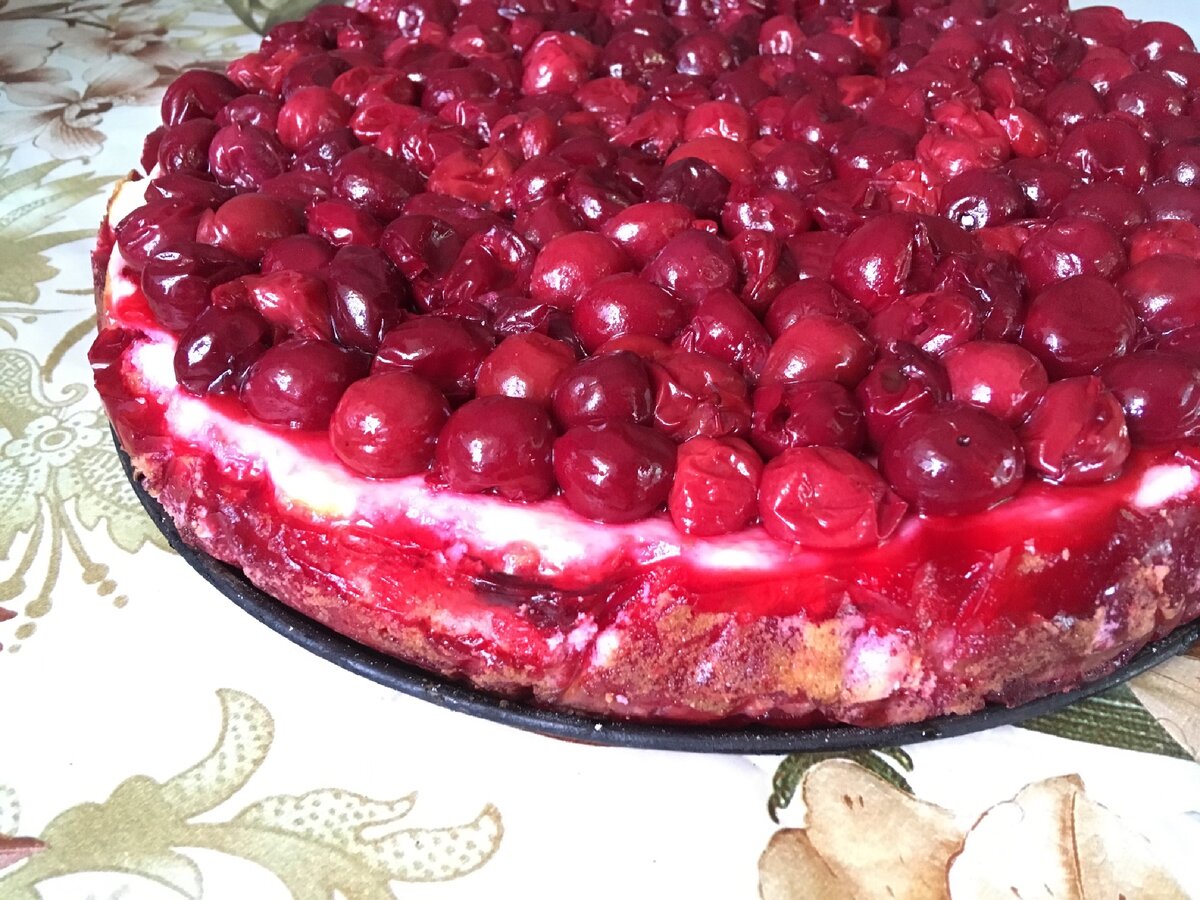 Вишню беру столько, чтобы она полностью покрыла поверхность торта два раза.
