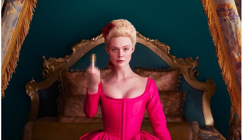 Сериал «Великая» с Эль Фаннинг шокировал всех уже первым своим постером — на нем Екатерина показывает зрителям средний палец. Я в принципе не особо люблю пародийные исторические фильмы и, судя по первым отзывам, ждала от сериала чего-то вроде «Самого лучшего фильма», где Галустян изображал Екатерину II — и мне совсем не казалось это смешным. Но в итоге скука пересилила страх — и я смогла составить свое мнение о сериале. По сюжету молодая Екатерина приезжает в Россию, чтобы выйти замуж за императора Петра III, и попадает в какой-то вертеп, где ее муж спит с женой лучшего друга, заболевших крепостных сжигают на кострах, а придворных в полном составе пытают, потому что царь заподозрил заговор. Сначала Екатерину это пугает, но потом она решает, что Россию надо спасать, и пытается взять дело в свои руки. Прежде всего стоит сказать, что создатели и не претендуют на историческую достоверность. Да, в сериале очень много стереотипов о России — медведи, водка, цыгане, постоянные крики «Ура!» к