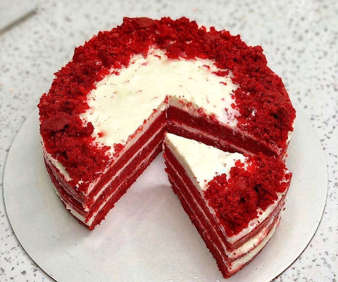 Ингредиенты Для бисквита: 1. Мука - 200 грамм (я использовала 1 50 грамм рисовой и 50 грамм кукурузной) 2. Яйцо З шт 3.Кефир 1 % ЗОО мл 4.Сода 1 чайная ложка 5.Какао 10 6.Краситель алый/красный 10 г 7.Разрыхлитель теста 5 г 8.Подсластитель по вкусу 9.Ванилин - по желанию Для крема: 1.Мягкий творог 350 г 2.Рикотта лайт 250 г 3.Подсластитель по вкусу Для пропитки: 1.Ягодный джем 10 г 2. Горячая вода - З ч л Готовим бисквит, для начала смешиваем кефир и соду, перемешиваем и оставляем на 15 минут. Отделяем белки от желтков. Добавляем к желткам кефир, просеиваем муку, добавляем разрыхлитель, подсластитель, какао, краситель(по желанию) , ванилин и тщательно перемешиваем до однородной консистенции. 4. Взбиваем белки до твердых пиков с добавлением щепотки соли и постепенно вмешиваем в тесто. Делим тесто на З равные части Выпекаем по одному коржу 17 минут при 180 градусах. Отстывшие коржив серху с помощью ножика выровнять , срезанное тесто будет использоваться для ук
