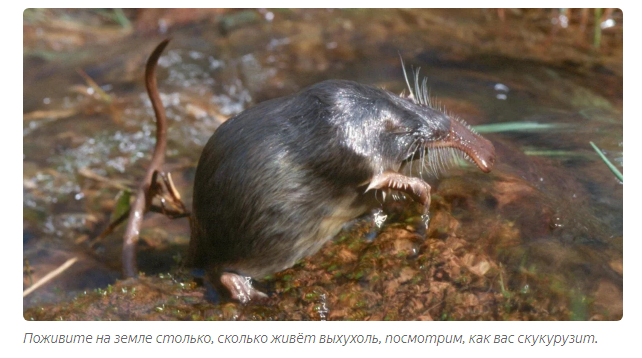 Выхухоль: сердце пловца,душа праотца! Это крыса? Это крот? Это бобр? Нет, друзья, это — выхухоль! Мы не обзываемся, просто наша сегодняшняя героиня, как кофе 3 в 1, совместила в себе вгсех вышеперечисленных животин. Удивляться не стоит, выхухоль — дитя своего времени. В ледниковый период, когда и появилась эта зверушка, вся фауна выглядела немного странно. В славные времена плейстоцена выхухоль жила на территории всей нынешней Европы: от Британских островов до Каспия. Сейчас же на планете живёт всего два вида выхухолей: нахухоль и похухоль. Ладно, шутим. На самом деле, пиренейская и русская — догадайся где они живут сам. Последняя тусит в поймах малых рек Дона, Волги и Днепра. Вообще выхухоль — крот, который ударился в водолазы. Это не аллегория, зверёк действительно относится к семейству кротовых. Для того чтобы переквалифицироваться из копателя оффлайн в профессионального пловца, животинке пришлось обзавестись соответствующими примочками. Мощные лапки-лопатки превратились в ласты, вы