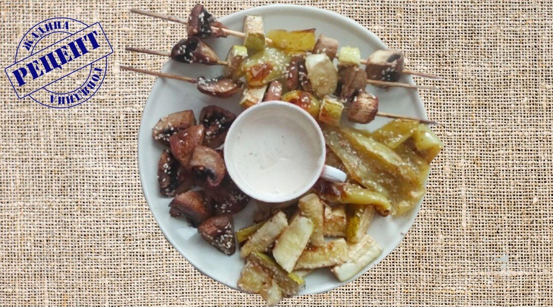 - Для подачи смешайте дип-соус из сметаны/майонеза, чеснока, ароматной зелени и специй по вкусу. Можно использовать для дипа остатки марината, которым смазывали овощи перед запеканием.
