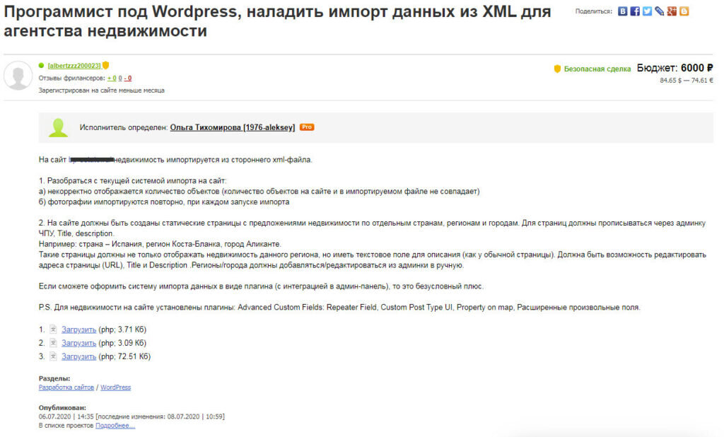 В качестве заказчика на подобном сайте я регистрировался впервые. Создал заказ на доработку сайта 06.07.2020 и пару дней получал предложения от исполнителей. Наконец, 08.07.2020 выбрал в качестве исполнителя некоего Алексея Тихомирова с аккаунтом PRO, 5 положительными отзывами и приятной аватаркой.